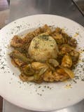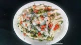 Marinated grilled shrimp with sautéed mixed vegetables served over seasoned rice.