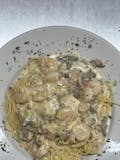 Shrimp stuffed with ricotta cheese and topped with mushrooms, fresh garlic, and our homemade buttery Rosa Maria sauce, served over spaghetti.